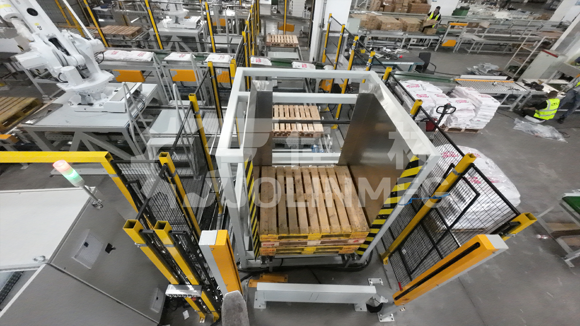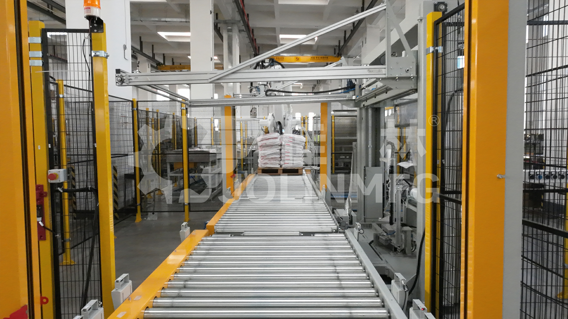 自動碼垛裹膜線,也稱為全自動托盤包裝生產(chǎn)線,是一條將產(chǎn)品從生產(chǎn)線末端開始,經(jīng)過自動整理、堆碼成垛、薄膜裹包,最終形成穩(wěn)定、堅固、適于運輸和存儲的托盤化單元的全過程自動化系統(tǒng)。